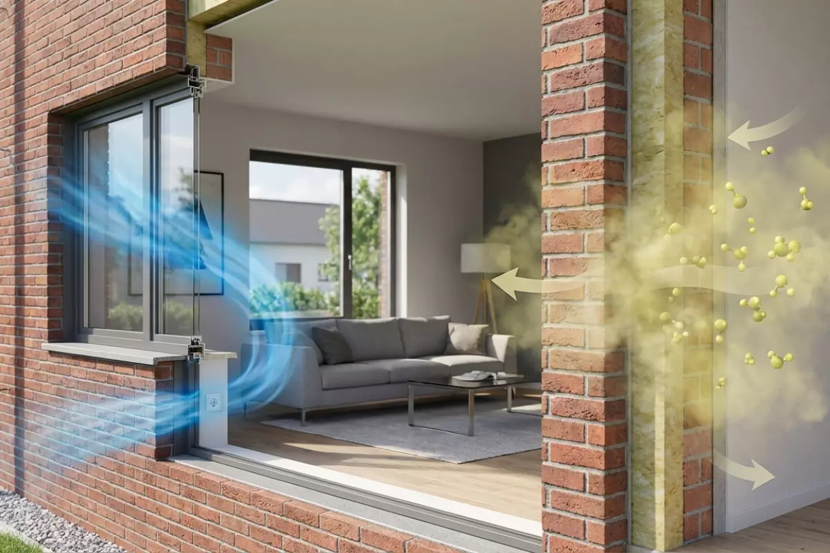 Под этим обычно смешивают две разные вещи: движение водяного пара через ограждающие конструкции и приток свежего воздуха в комнаты. Первое связано с влагорежимом стен, второе — с вентиляцией и качеством воздуха. После утепления чаще всего «ломается» именно ожидание, что стены сами обеспечат нормальный воздухообмен.
