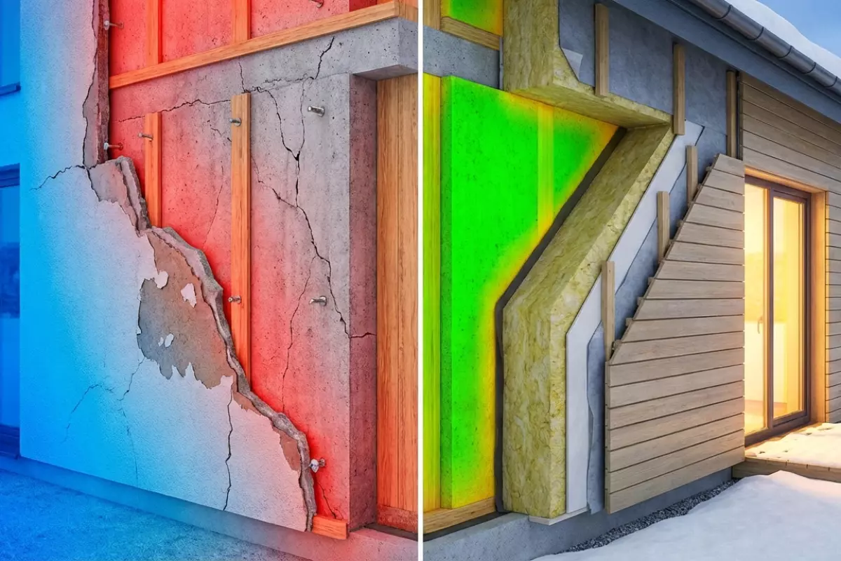 Резкие смены нагрева и охлаждения заставляют материалы «играть»: дерево и бетон по-разному расширяются, штукатурка и отделка получают микротрещины, а крепёж со временем разбалтывается. Когда утепление сделано правильно, температура внутри стены меняется плавнее, и конструкция меньше испытывает циклы напряжений.
