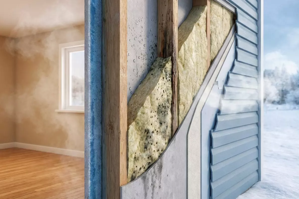 Теплоизоляция меняет то, где именно в стене «встречаются» тёплый влажный воздух из помещения и холод с улицы. Если слои подобраны неверно, водяной пар начинает конденсироваться внутри конструкции: намокает утеплитель, сыреют деревянные элементы, ускоряется коррозия крепежа, а отделка может «поплыть».