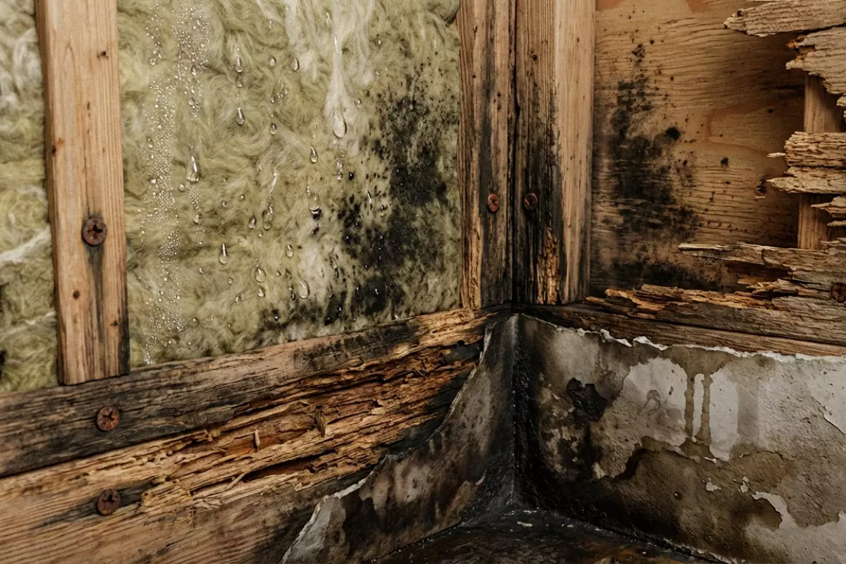 - Наружные воздействия: косой дождь, капиллярный подсос от фундамента, протечки кровли и водостоков.