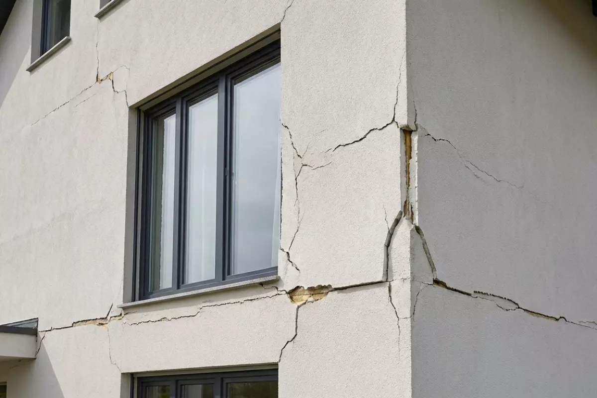 - Штукатурный слой и армирующая сетка — появляются «паутинки», трещины по диагонали от углов проёмов, отслоения по границе слоёв.