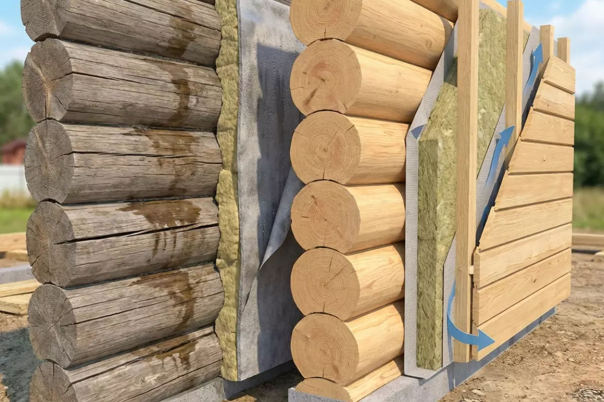 У дерева есть своя «логика» поведения: оно меняет размеры по влажности, даёт усадку, а стыки венцов со временем могут «играть». Поэтому при выборе схемы теплоизоляции важно не только набрать толщину, но и сохранить нормальный влагообмен, чтобы стены не начали преть, а швы не превращались в постоянный источник продуваний.