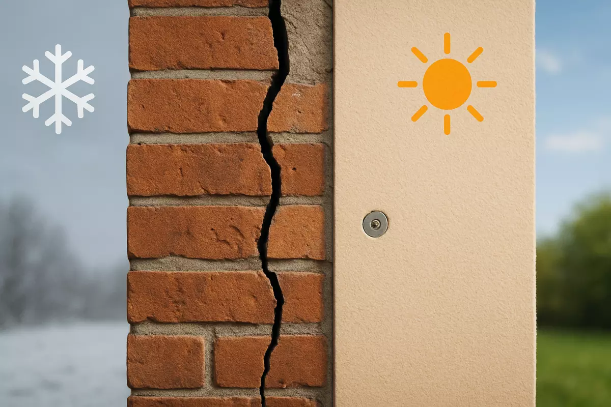 Резкие изменения температуры заставляют материалы стены постоянно «двигаться»: расширяться при нагреве и сжиматься при охлаждении. Если разные слои конструкции реагируют по-разному (кирпич, бетон, штукатурка, клей, утеплитель), в местах стыков и ослаблений накапливаются напряжения — и со временем это вылезает в виде микротрещин, а затем и заметных разрывов.