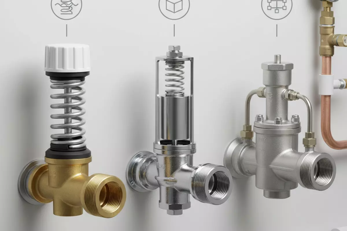 Выбор обычно упирается в то, как именно устройство держит заданный напор: за счёт пружины и мембраны, поршня или более «точной» пилотной схемы. От этого зависят стабильность на разных расходах, чувствительность к грязной воде и требования к обслуживанию.