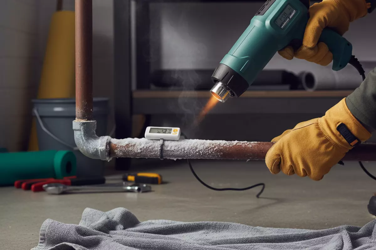 - Фен (строительный или бытовой) — удобен для локального прогрева открытых участков. Держите поток на расстоянии, постоянно перемещайте, не упирайте сопло в трубу.