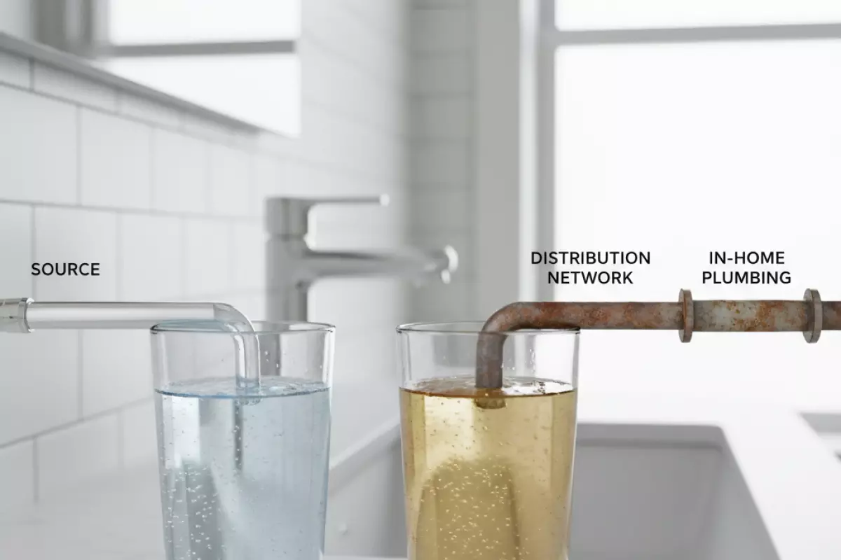 Рыжий оттенок, муть и «болотный» или металлический запах часто появляются не из-за одной причины, а из-за комбинации: что именно приходит из водозабора и что успевает «подмешаться» по пути через сеть и внутридомовые коммуникации. Поэтому важно разделять симптомы: одни возникают сразу на входе в дом, другие — уже после прохождения по стоякам и разводке.