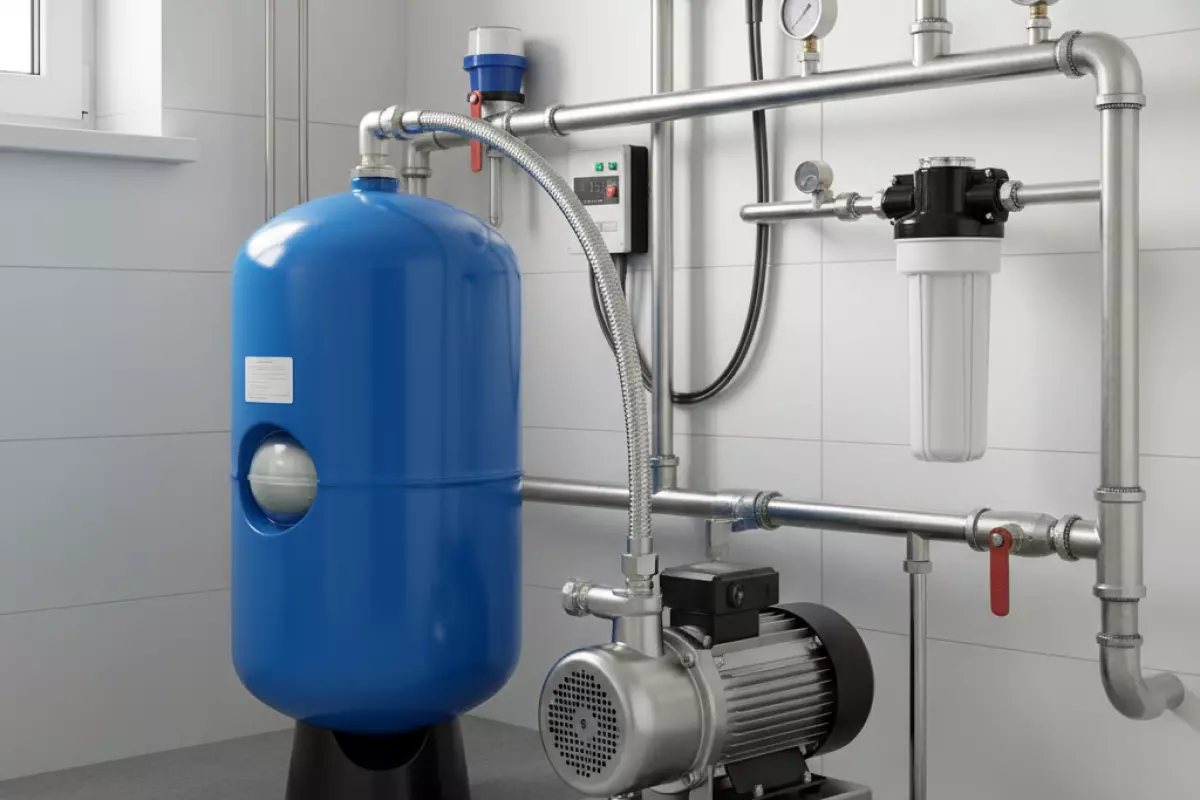 Смысл бака с мембраной в том, чтобы сгладить работу системы: часть воды хранится под давлением и отдается в сеть без мгновенного запуска электродвигателя. В результате насос включается реже, работает более ровно и меньше нагревается, а давление в кранах не «пилит» вверх-вниз при каждом открытии.