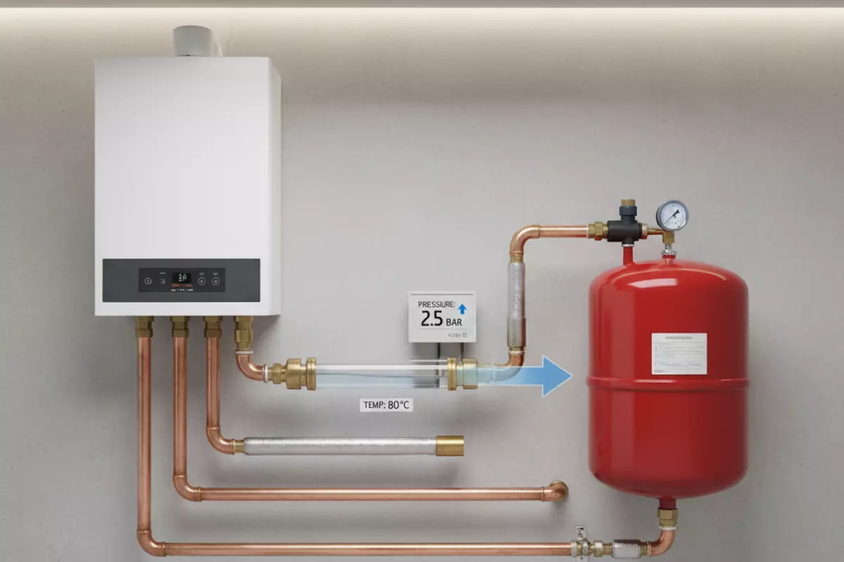 В закрытом контуре отопления или ГВС вода при нагреве увеличивается в объёме. Если этому расширению «некуда деваться», давление быстро растёт: начинает срабатывать предохранительный клапан, появляются протечки на слабых соединениях, а котёл может уходить в ошибку по давлению. Расширительный бак как раз и принимает лишний объём теплоносителя, удерживая давление в рабочем диапазоне.