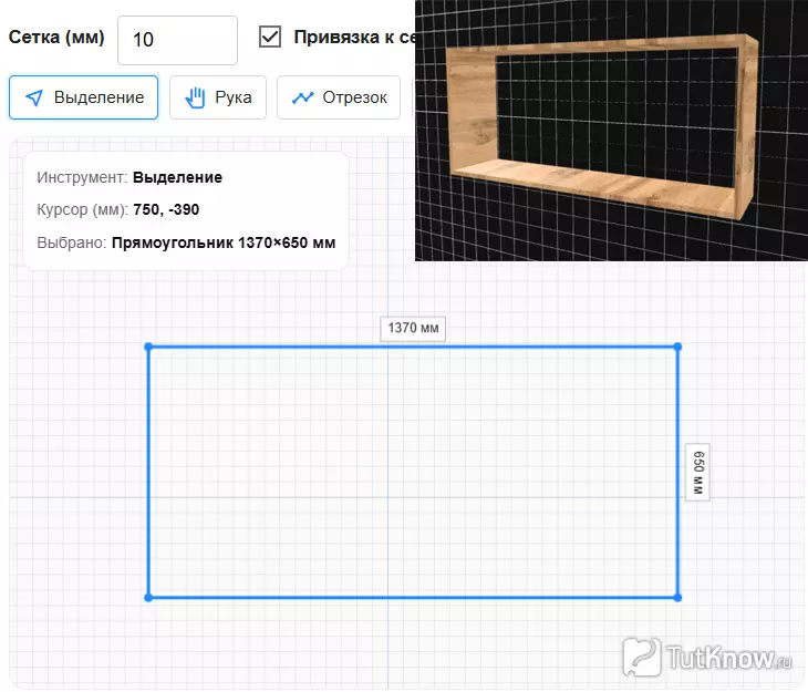 | Отрезок | Создавать прямые полки, перегородки и соединительные элементы с точной длиной |