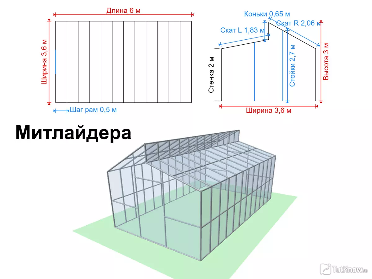 Теплица Митлайдера — это конструкция с асимметричной двускатной крышей и вертикальными стенками, в которой один скат выше другого. Между скатами располагается продольная вентиляционная зона, обеспечивающая постоянный приток свежего воздуха без сквозняков.