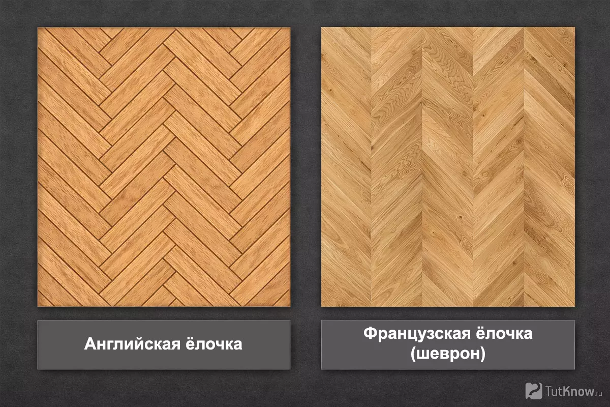 - Ёлочка — диагональная укладка с повышенным расходом материала. Используется в двух вариантах: английская ёлочка и французская ёлочка (шеврон).