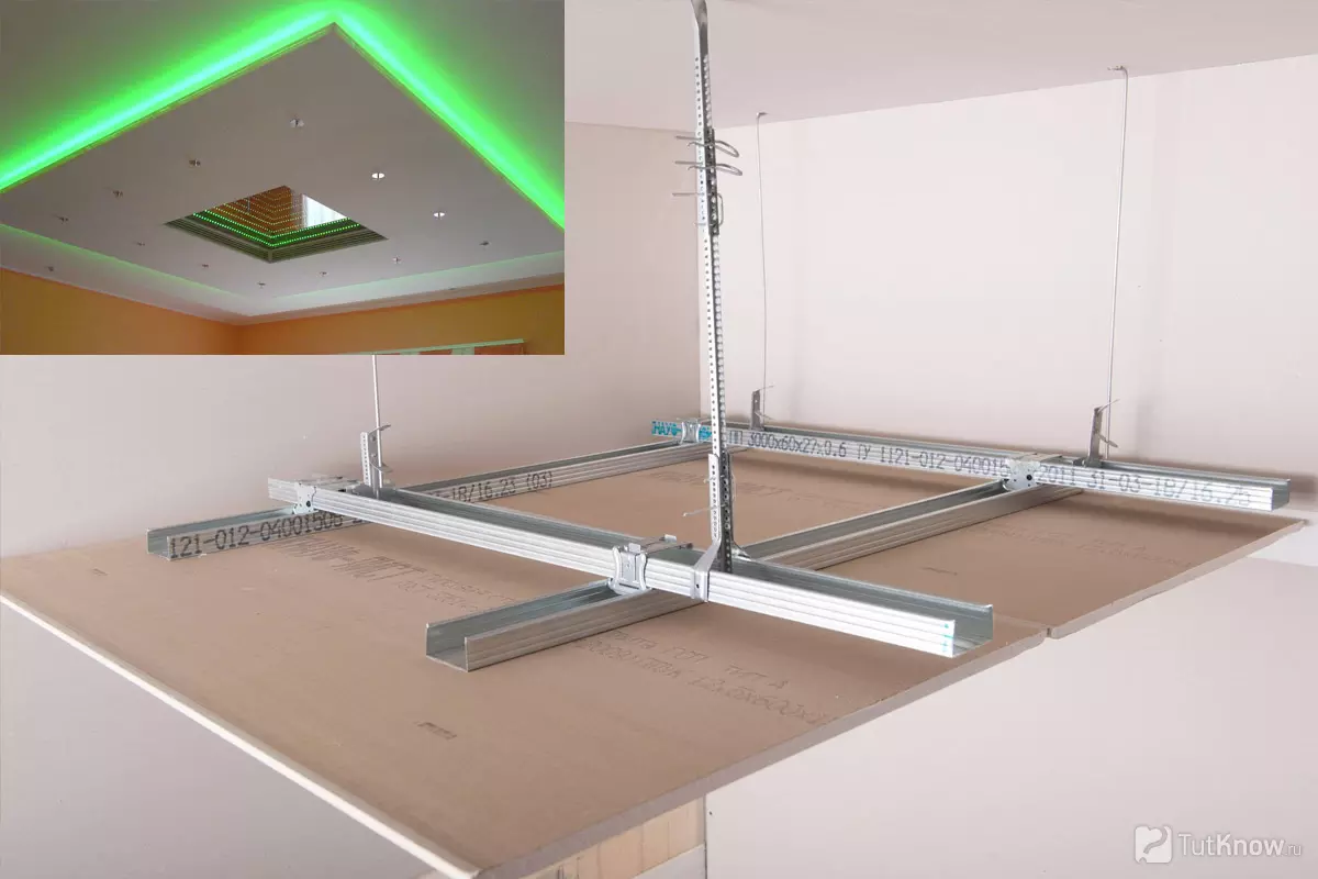 - Читайте также, как сделать двухуровневый потолок из гипсокартона.