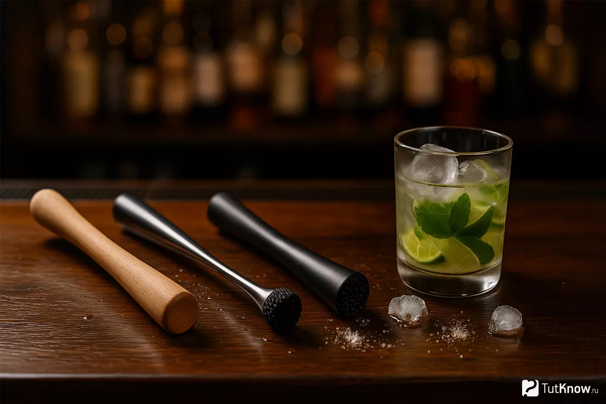 Пресс для раздавливания фруктов, ягод, трав или сахара на дне бокала. Используется в Мохито, Кайпиринье, Джулепе и других коктейлях. Делают из дерева, металла или пластика — главное, чтобы поверхность была гладкой и не впитывала ароматы.
