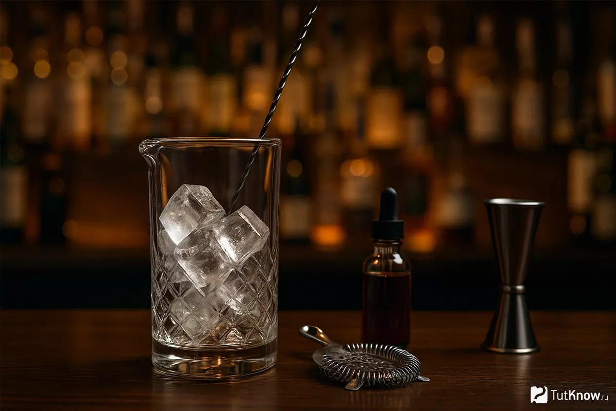 Толстостенный стеклянный стакан для стирра — используется для крепких прозрачных напитков (Негрони, Олд Фэшн, Манхэттен). В него кладут лёд, ингредиенты и размешивают барной ложкой 20–30 секунд, после чего процеживают через стрейнер.
