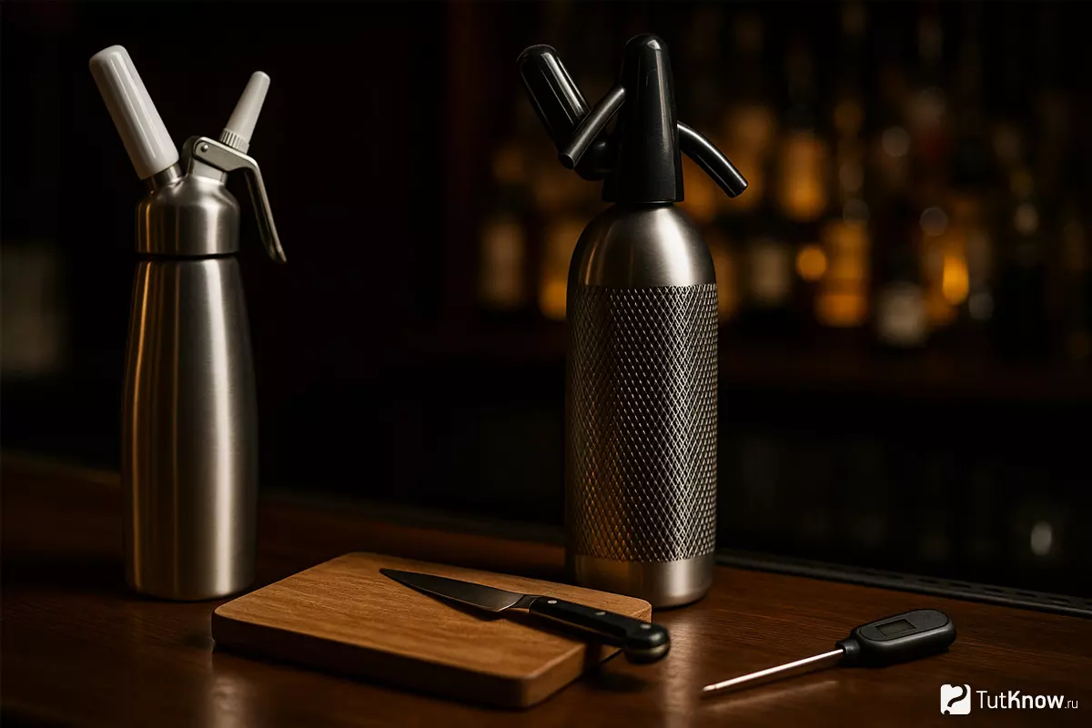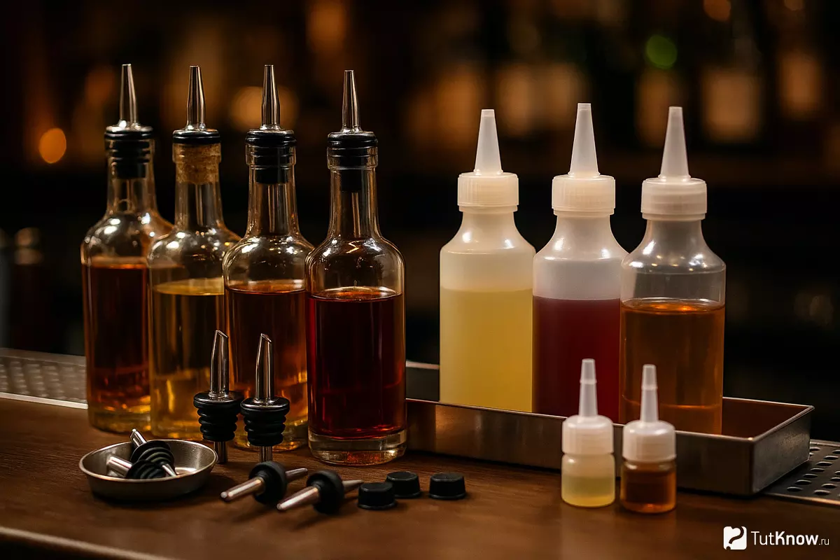 Насадки для бутылок с узким носиком — помогают наливать ровно и дозированно. В барах их ставят на все спирты и сиропы. Для домашних условий можно использовать бутылки-дозаторы или шприц-диспенсеры для сиропов.