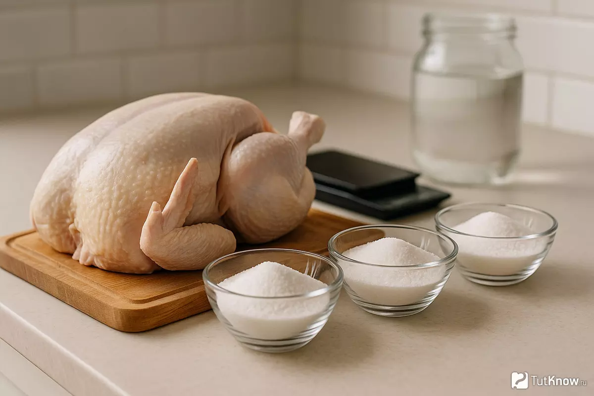 | 5% (≈ 50 г соли на 1 л) | Целая курица, универсальные рецепты, стандартная сочность |