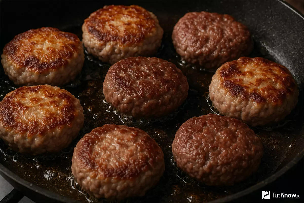 - Не перегружайте сковороду. Если котлеты лежат слишком плотно, они начнут тушиться вместо жарки.