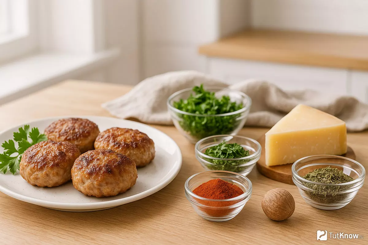 - Дополнительные добавки. Зелень, паприка, базилик, пармезан и мускатный орех считаются исходя из веса фарша, чтобы вкус оставался сбалансированным и не перебивал мясо.