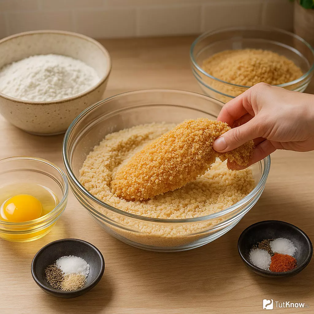 - Если хотите очень хрустящий слой, используйте схему: яйцо → панировка → яйцо → панировка.