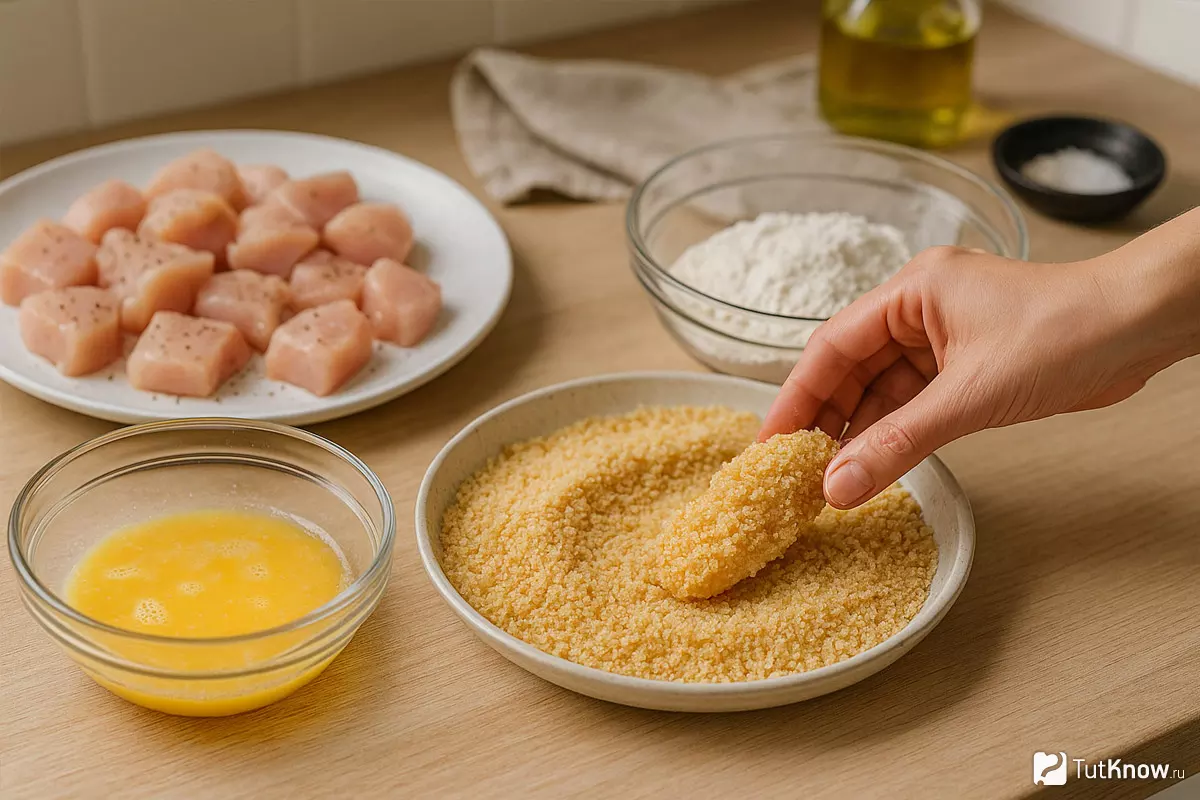 | Классическая (мука + сухари) | Отбивные, котлеты, наггетсы, куриное филе |