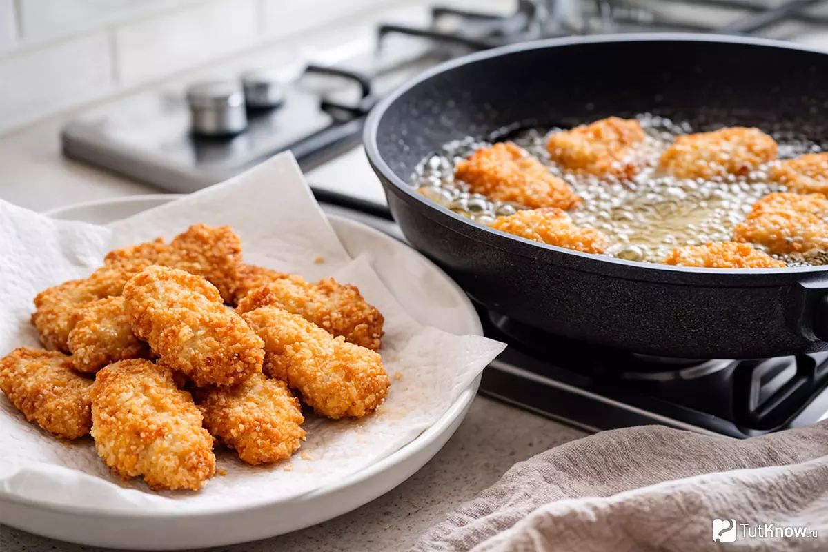 Фритюр лучше всего раскрывает панировку с сухарями и крахмалом. Если вы используете смесь, рассчитанную калькулятором, корочка получится лёгкой, равномерной и очень хрустящей даже без лишнего масла.