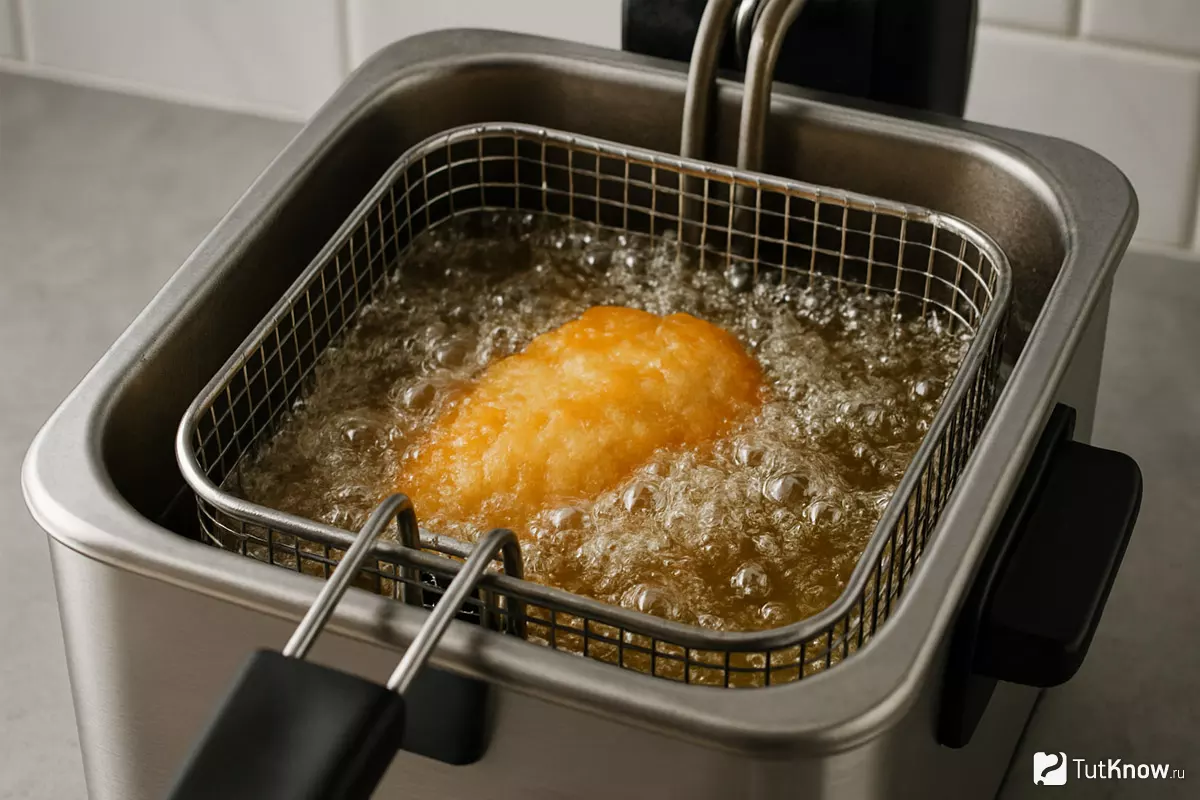 Фритюр — самый быстрый способ получить идеально ровную, плотную и очень хрустящую панировку. Горячее масло мгновенно «запечатывает» верхний слой, поэтому корочка получается устойчивой, а внутри продукт остаётся сочным.