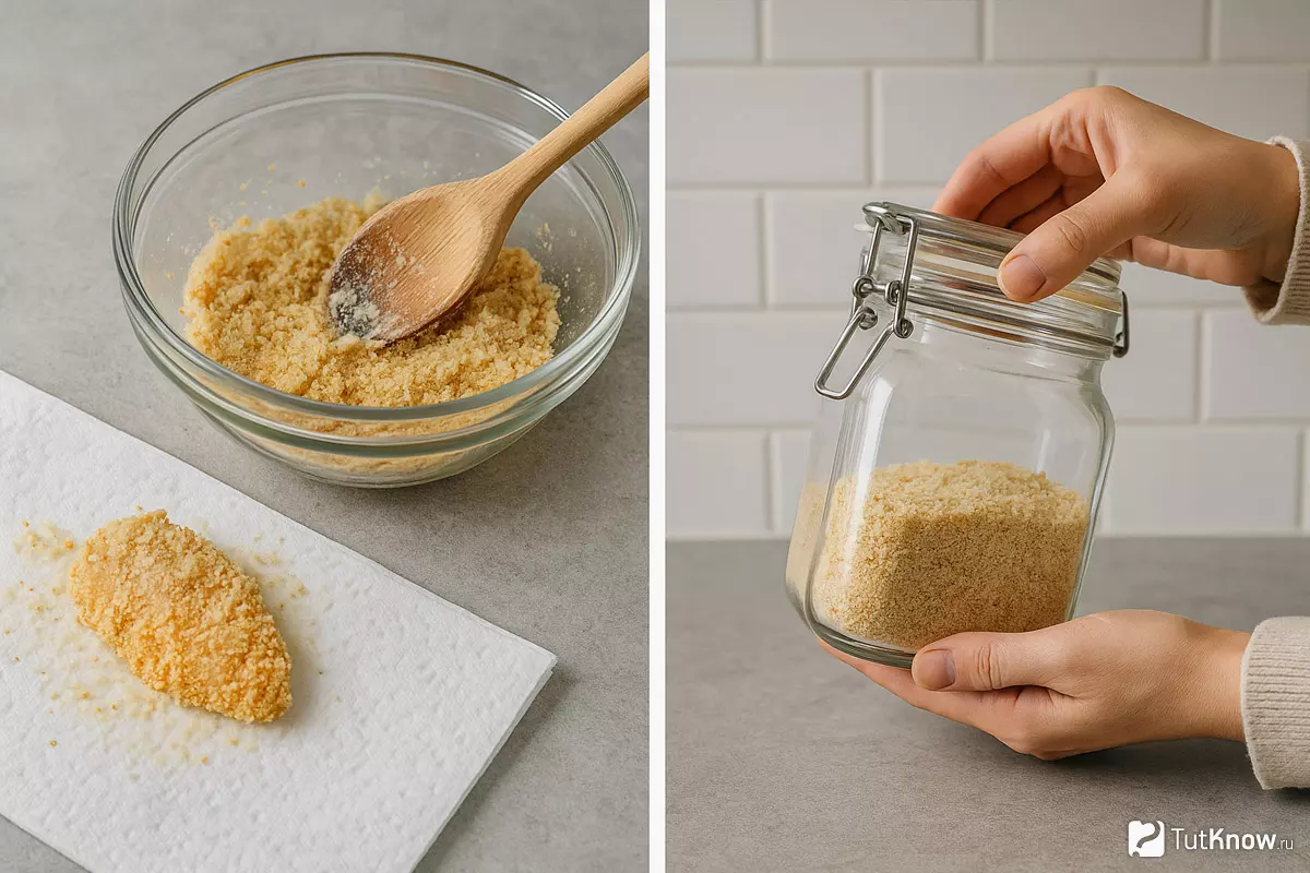 - Лучше не смешивать сухари крупного и мелкого помола заранее — они дают разный хруст.