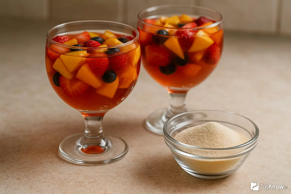 Важно: свежие ананас, папайя, киви и манго содержат ферменты, полностью разрушающие желатин. Для таких фруктов подходит только агар-агар или предварительная термическая обработка фруктов.