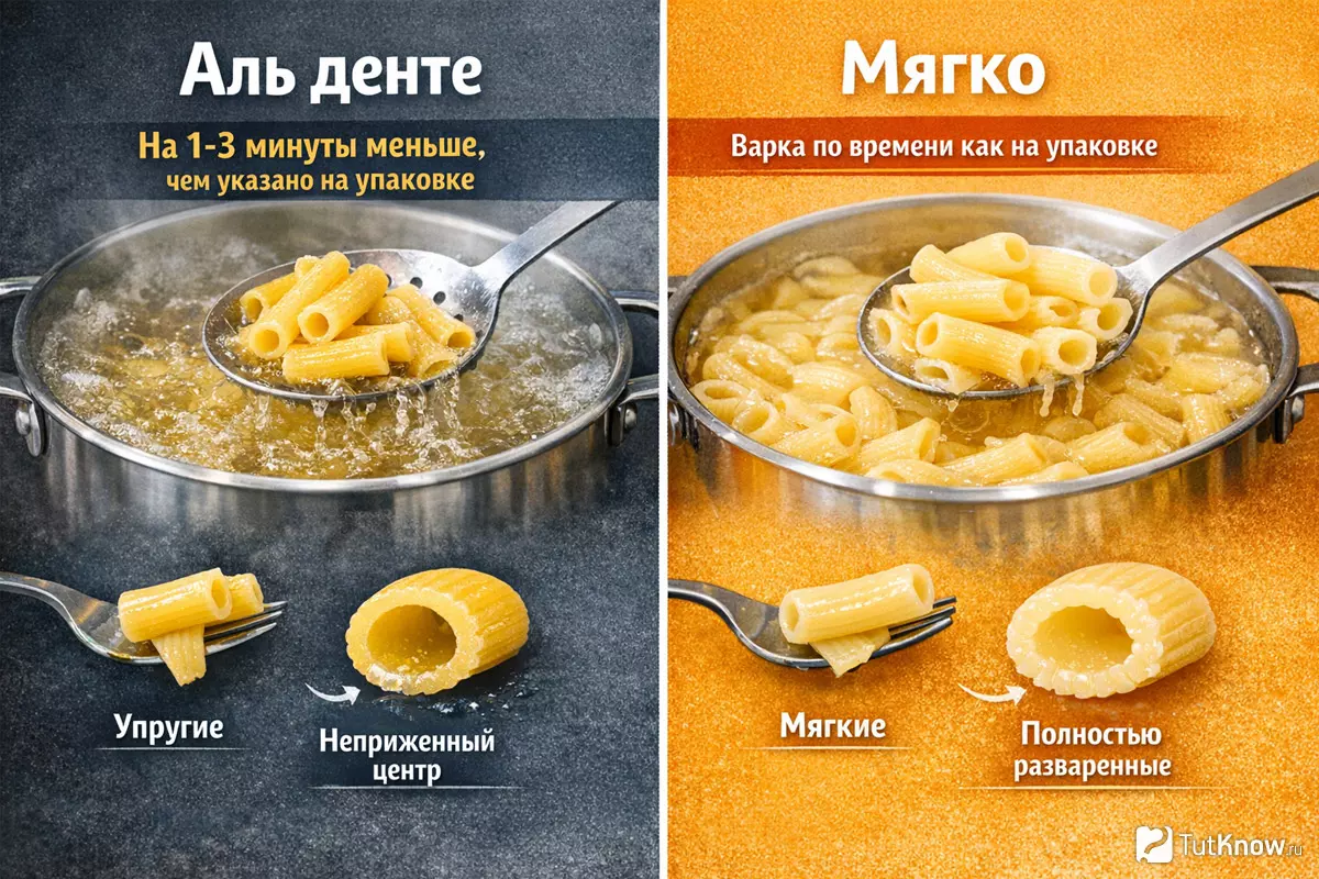 | Макароны | Слегка упругие внутри, не разваливаются, сохраняют форму | Полностью мягкие, легко разламываются, без плотной сердцевины |