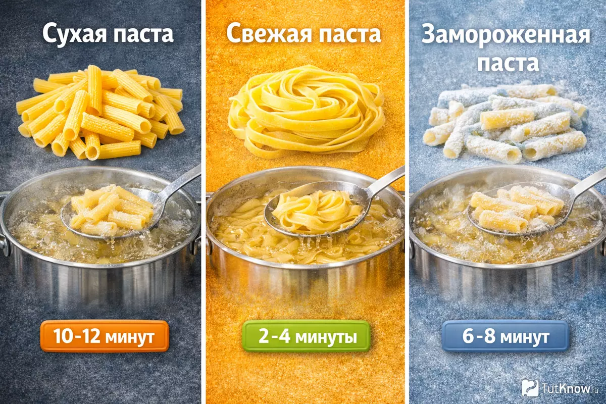 | Формат пасты: сухая / свежая / замороженная | Свежая — варится заметно быстрее; замороженная — быстрее сухой, но зависит от изделия |