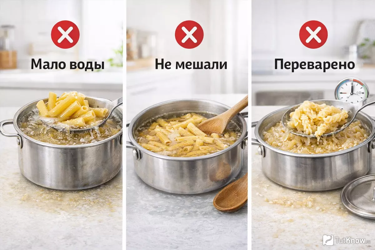 | Слипшиеся макароны | Комки и неравномерная варка | Больше воды и перемешивание в начале |