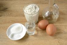 1. Замесим тесто. Соль растворим в водке и соединим с яйцами. Перемешаем.