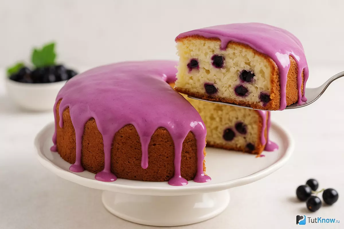 Если хотите украсить пирог, можно приготовить простую глазурь с яркими фиолетовыми потёками по бокам.