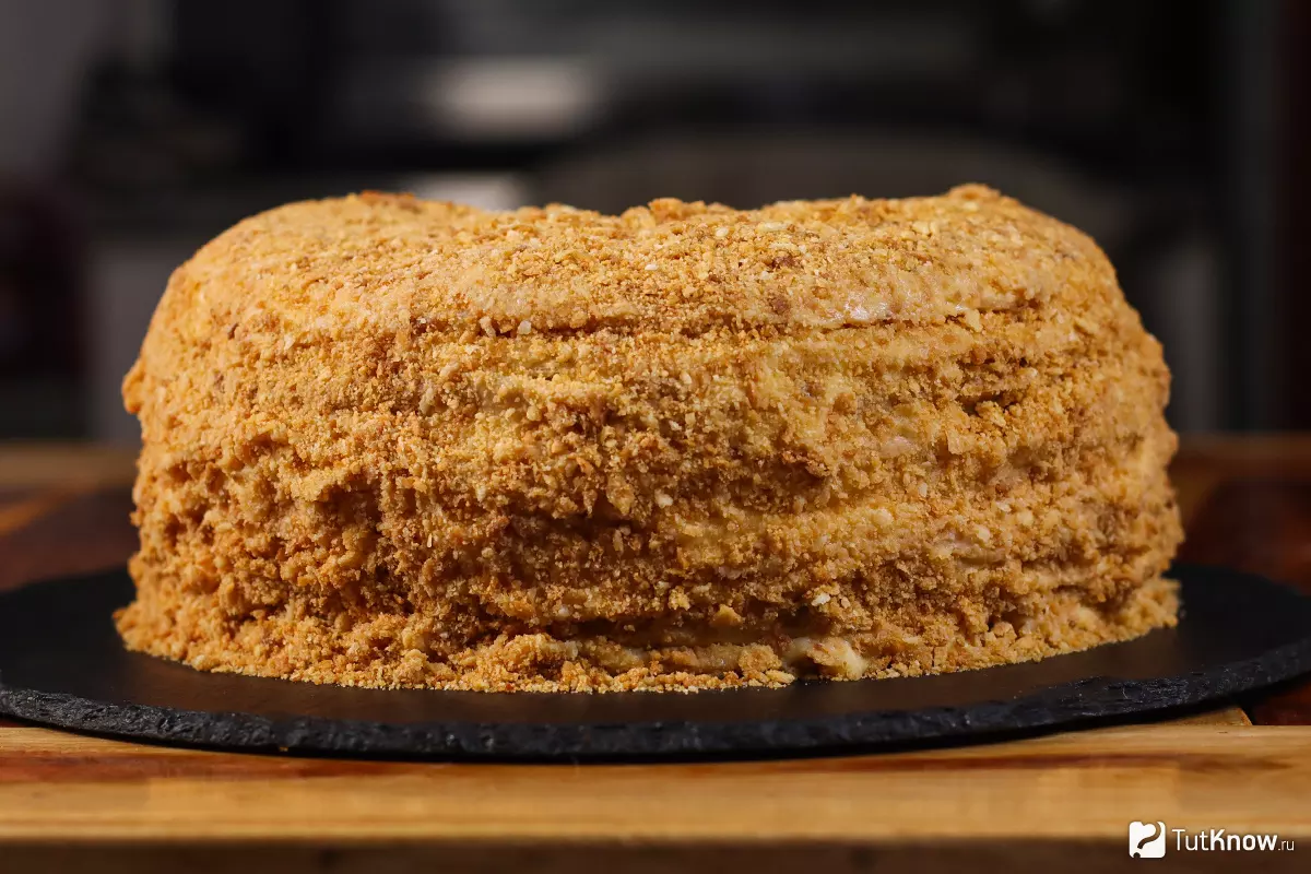 После того как коржи и крем полностью остыли, можно переходить к сборке. На блюдо по центру чуть намажьте крема, чтобы коржи не елозили и выложите первый корж, смажьте его кремом и так поступайте с каждым слоем. Бока и верх торта также покройте кремом, а затем обсыпьте крошкой из обрезков. Я сделал крошку скалкой, можно в блендере перемолоть.