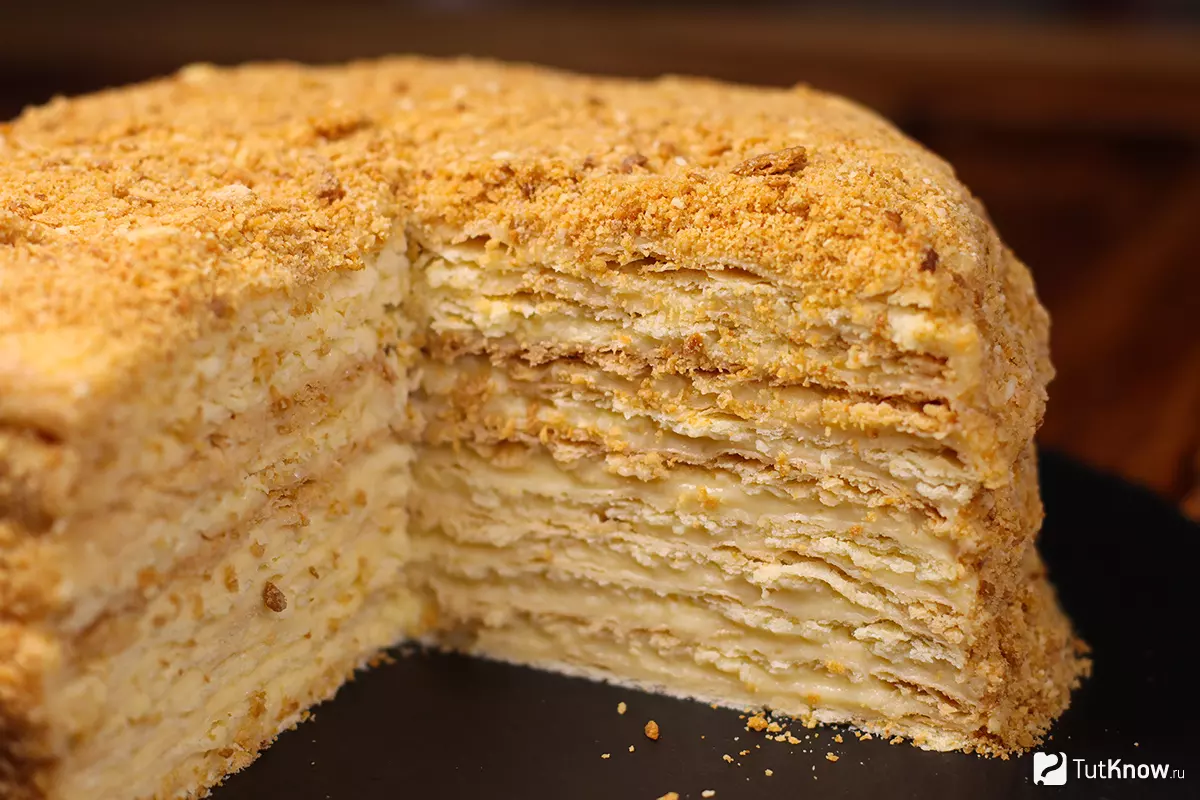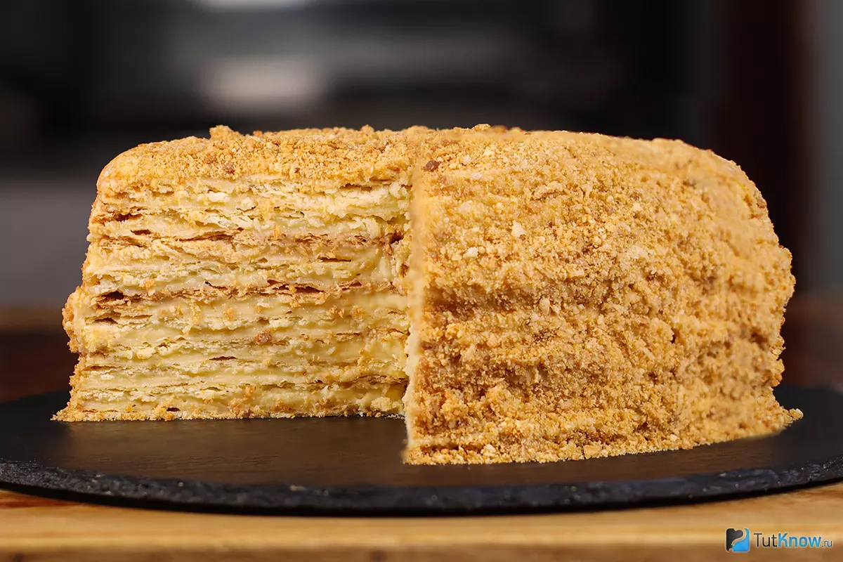 На фотографии готовый торт Наполеон по моему рецепту описанному здесь в статье для TutKnow.ru. Повторите - получите точно такой же вкусный результат! Коржи хрустящие и хорошо пропитанные кремом, торт ровный, нигде не просел, а вкус... попробуйте сами и напишите в комментариях!