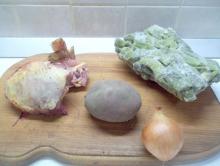 1. Курицу или куриные части помойте и высушите бумажной салфеткой. Кухонным топором порубите ее на более мелкие части. Если имеется жир на птице, то его снимите, либо если вам не страшны лишние калории, то можете его оставить. Тушку можно использовать бойлерную, но более наваристый суп получится с домашней курицей.