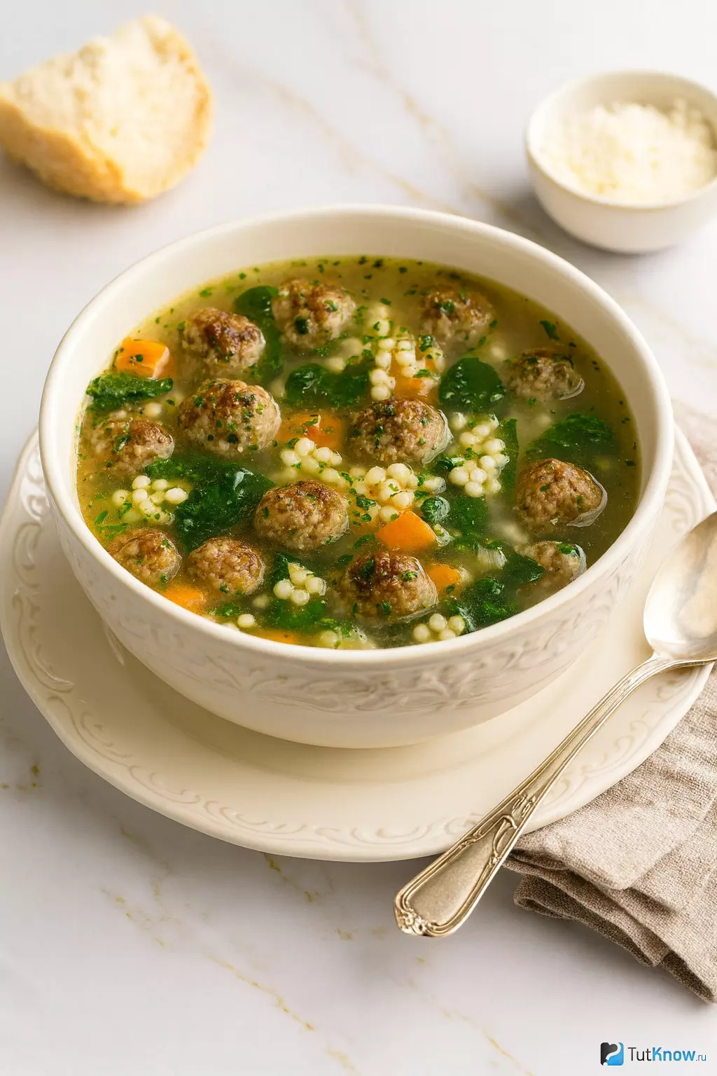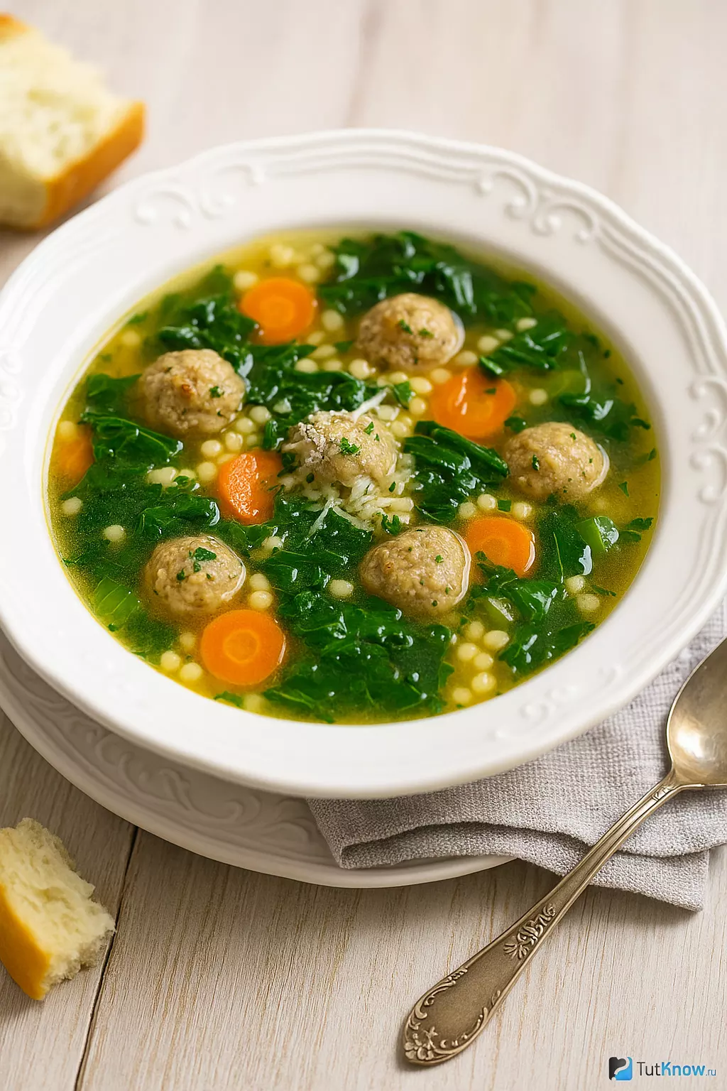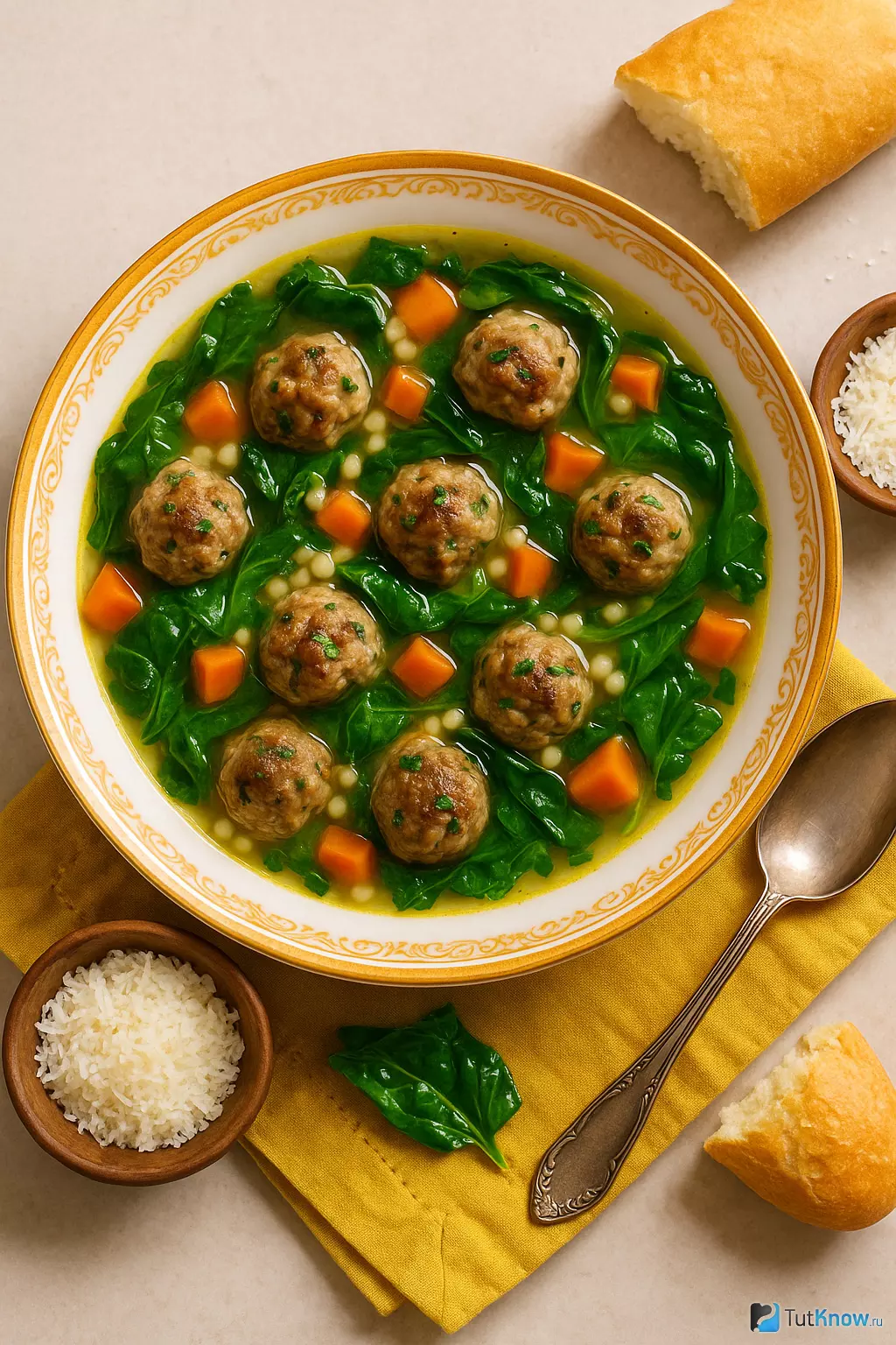 Итальянский свадебный суп (minestra maritata) — это насыщенное и ароматное блюдо, в котором сочетаются нежные мясные фрикадельки, свежие овощи, шпинат и мелкая паста. Его название символизирует «союз» мяса и зелени, а не свадебную церемонию. Суп подают горячим, он сытный, согревающий и отлично подходит для семейных обедов в любое время года.