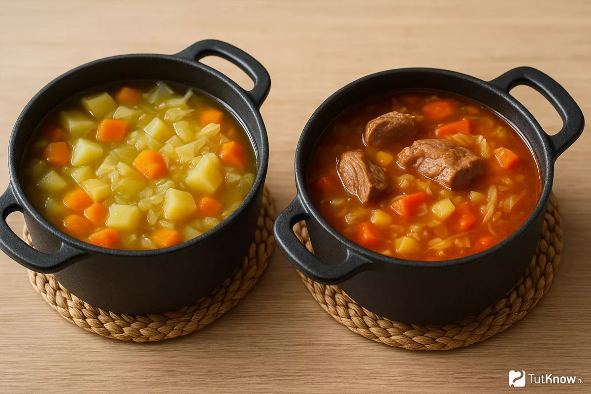 | Постный | Лёгкий, подходит для вегетарианцев | Морковь, лук, сельдерей, капуста |