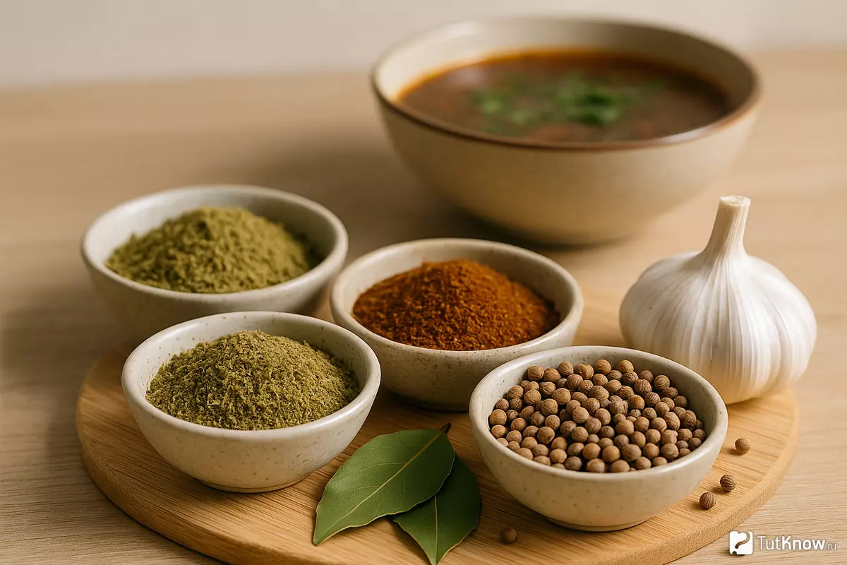 Не менее важны и специи. Они придают блюду характерный вкус и аромат. Основными специями для харчо являются уцхо-сунели, хмели-сунели, кориандр, лавровый лист и перец. Не забудьте добавить чеснок и свежую зелень — кинзу и петрушку, которые завершат композицию вкусов.