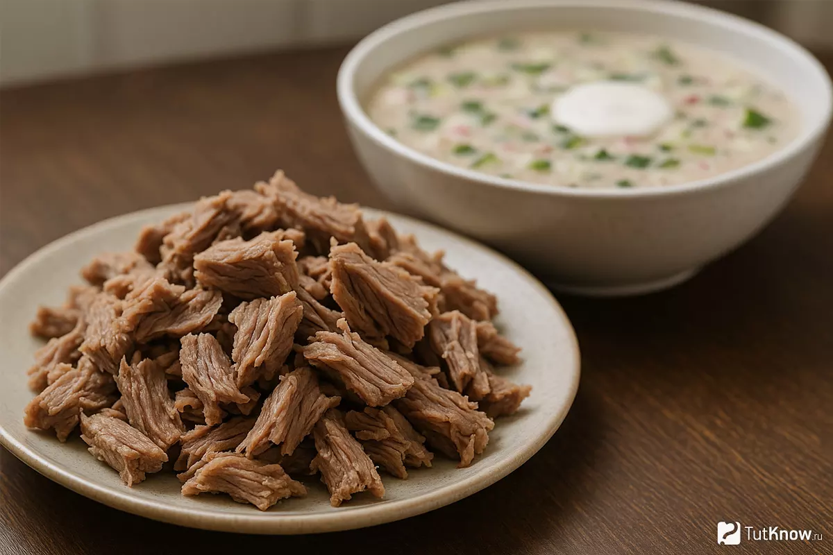 После того как говядина сварилась, дайте ей немного остыть в бульоне. Это позволит мясу впитать ароматы и сохранить сочность. Нарежьте его небольшими кубиками и добавьте в окрошку. Такой подход гарантирует, что говядина в вашем блюде будет мягкой и вкусной.