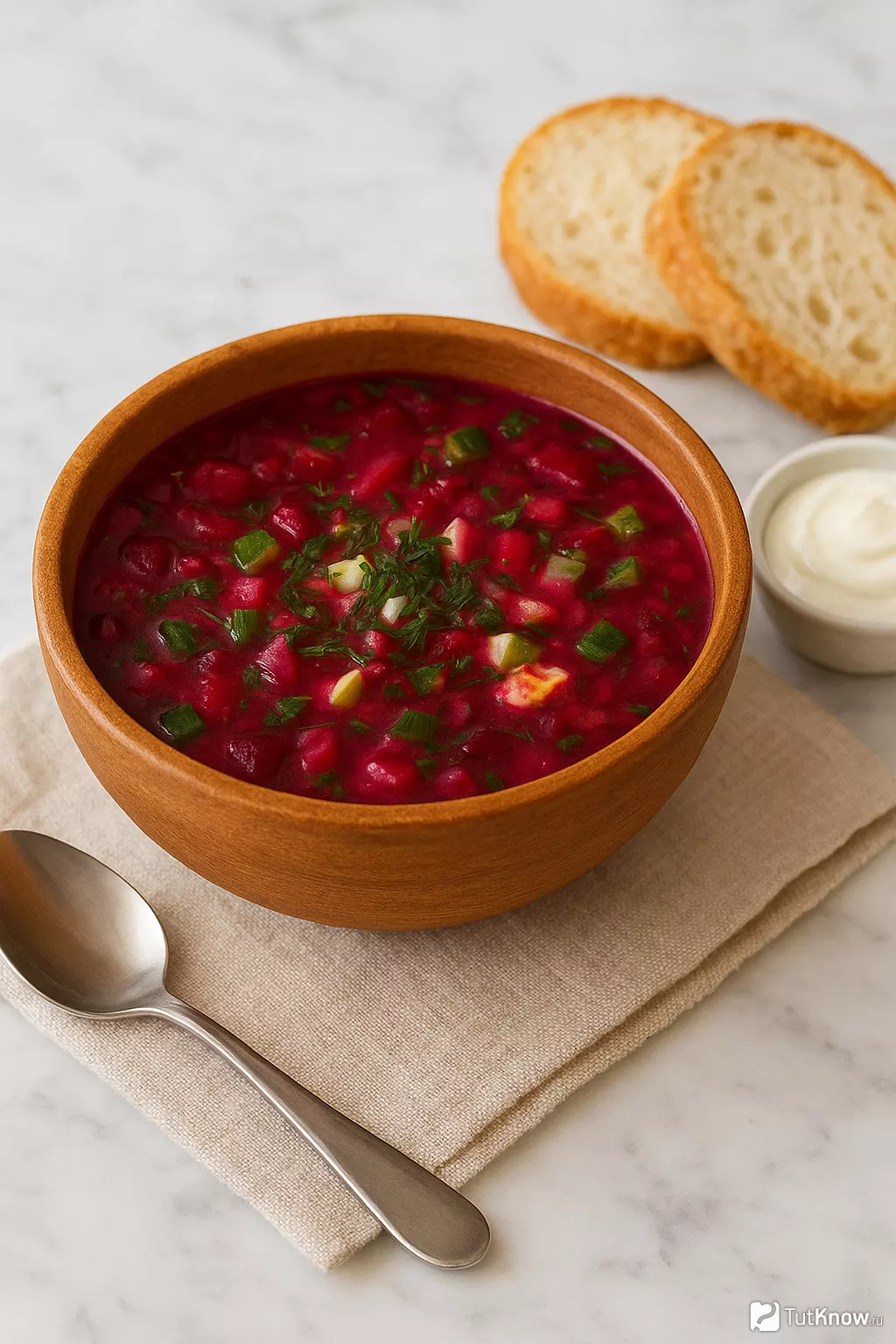 Свекольник — это традиционный русский холодный суп на основе отвара из свеклы. Он обладает кисло-сладким вкусом и включает свеклу, огурцы, зелень и вареные яйца, что придает ему свежесть и легкость. Это блюдо особенно популярно в жаркие летние дни благодаря своей способности освежать и насыщать организм витаминами и минералами. Свекольник известен с XIX века и традиционно подается летом.