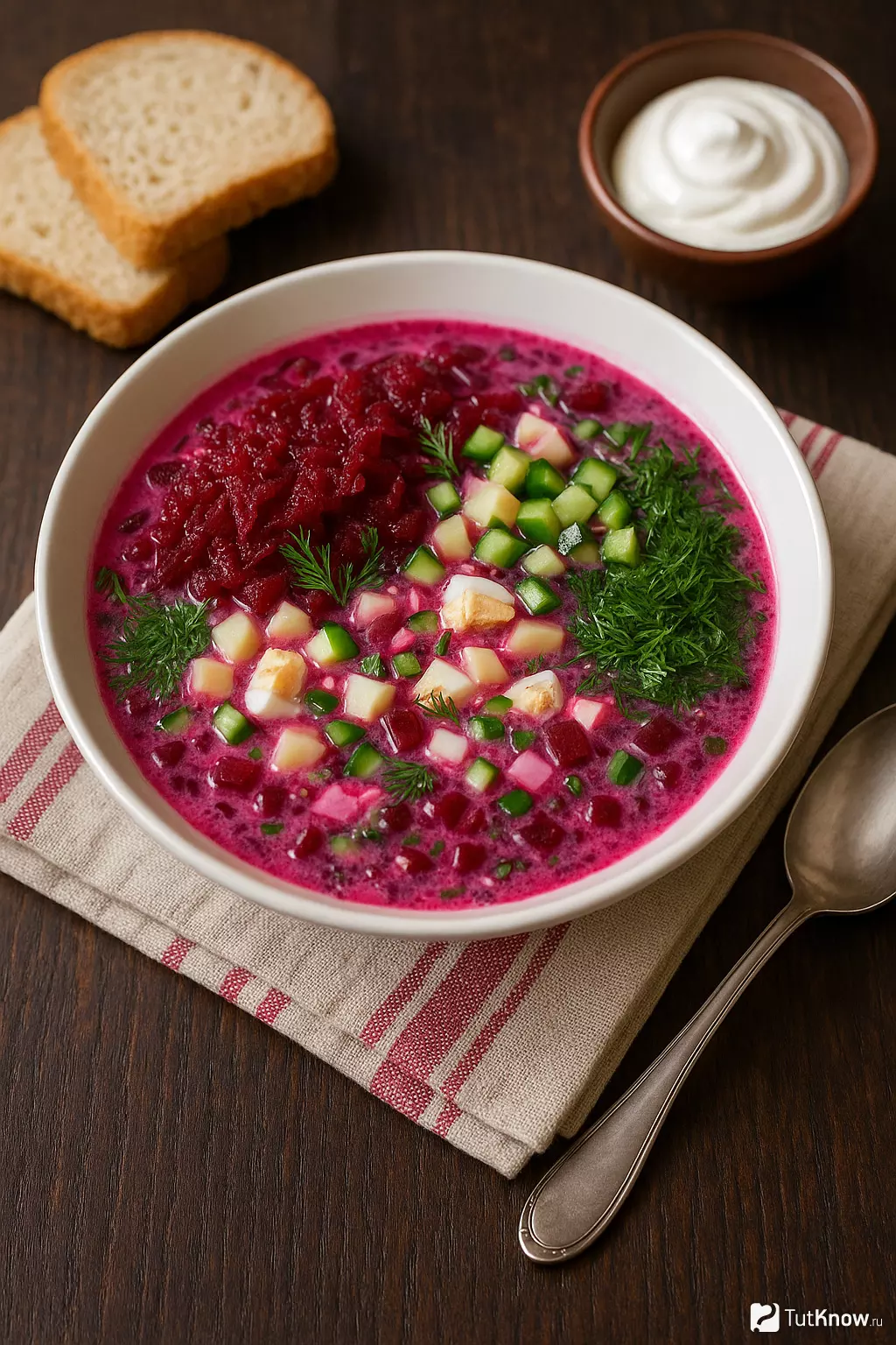 Этот холодный суп любит точность: аккуратно сварите или запеките свеклу, хорошо охладите основу и добавляйте свежую зелень прямо перед подачей — так вкус получится ярким, а цвет насыщенным.