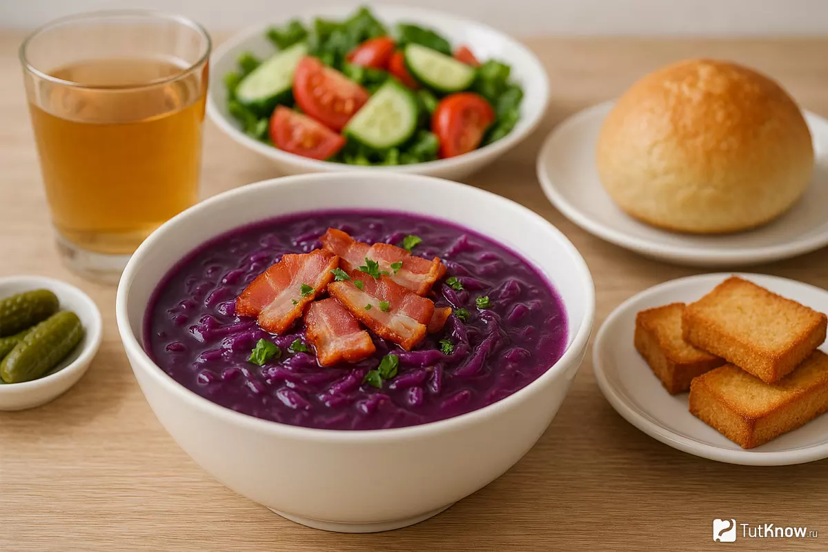 Суп из красной капусты с беконом — это насыщенное и ароматное блюдо, которое можно дополнить различными гарнирами и закусками. Прекрасным дополнением станут свежие хрустящие булочки или чесночные гренки. Их можно приготовить заранее и подать вместе с супом, чтобы добавить текстурное разнообразие.