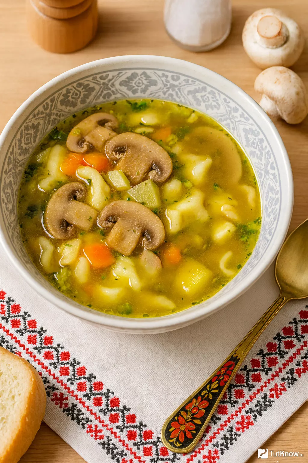 Украинский суп с грибами и галушками — это традиционное блюдо, известное своей простотой и сытностью. Основу супа составляют свежие или сушеные грибы, придающие ему насыщенный аромат, и галушки из теста на основе муки и яиц, добавляющие текстурную контрастность. Особенно популярен этот суп в осенне-зимний период, когда грибы в изобилии, а его ингредиенты доступны и просты в приготовлении.
