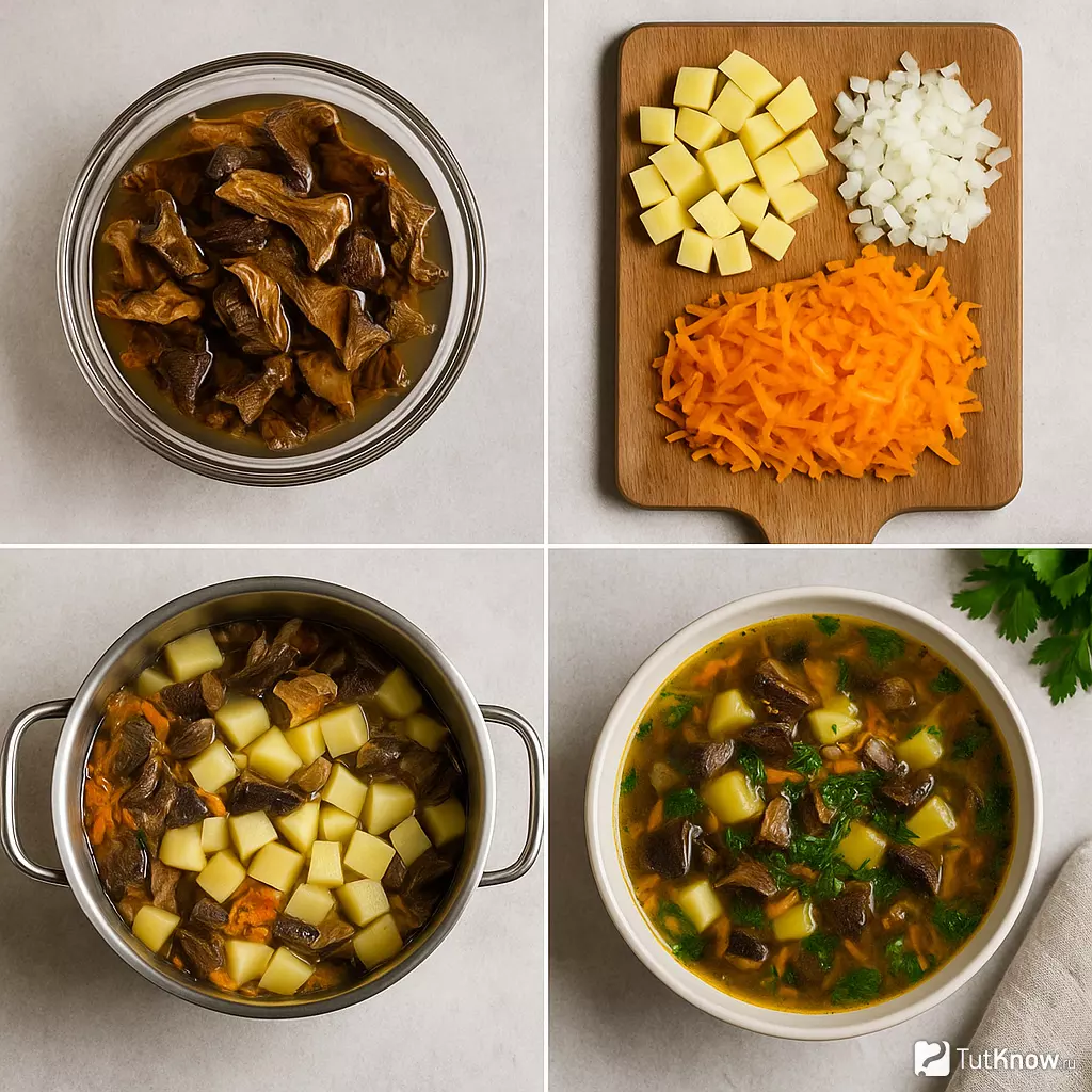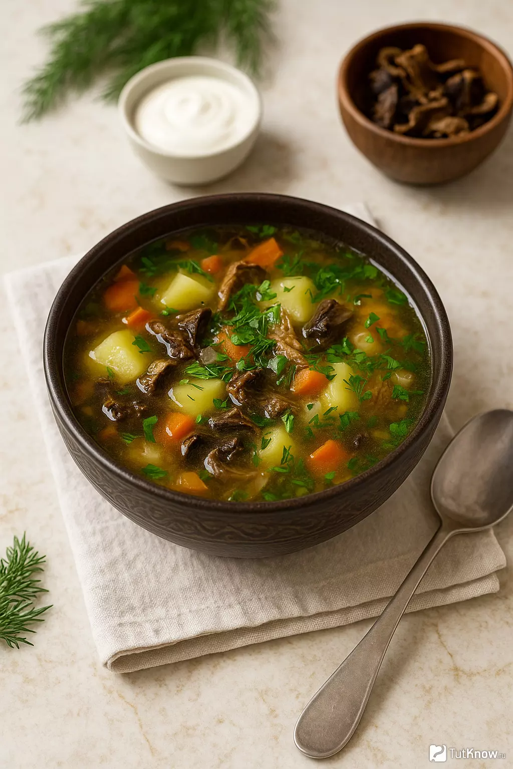 Постный суп из сушёных грибов — простое и вкусное блюдо без мяса. Основу составляют сушёные грибы, которые придают насыщенный аромат, а также овощи и специи, добавляющие разнообразие текстур. Этот суп особенно актуален в постные дни или для вегетарианцев. В русской кухне грибы исторически служили доступным и питательным заменителем мяса, особенно зимой.