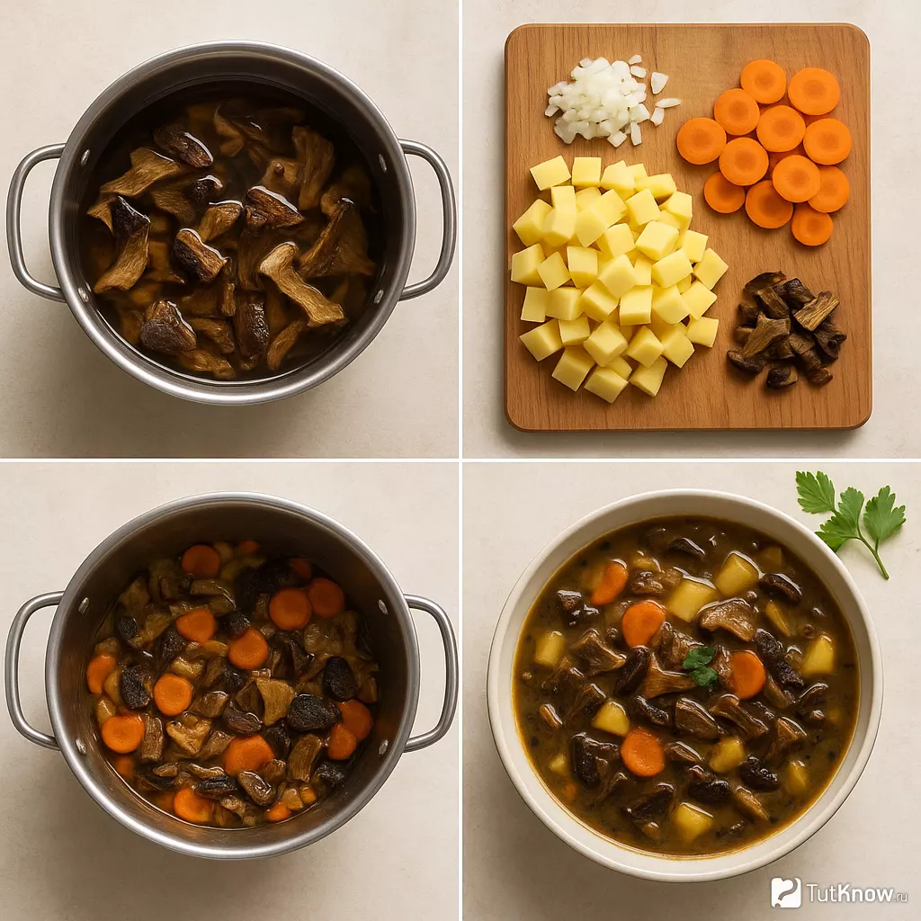 После замачивания грибы следует мелко нарезать. Это позволит им быстрее развариться и сделать суп более густым. Используйте воду, в которой замачивались грибы, в качестве основы для бульона. Она уже насыщена грибным вкусом и ароматом.