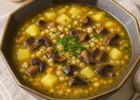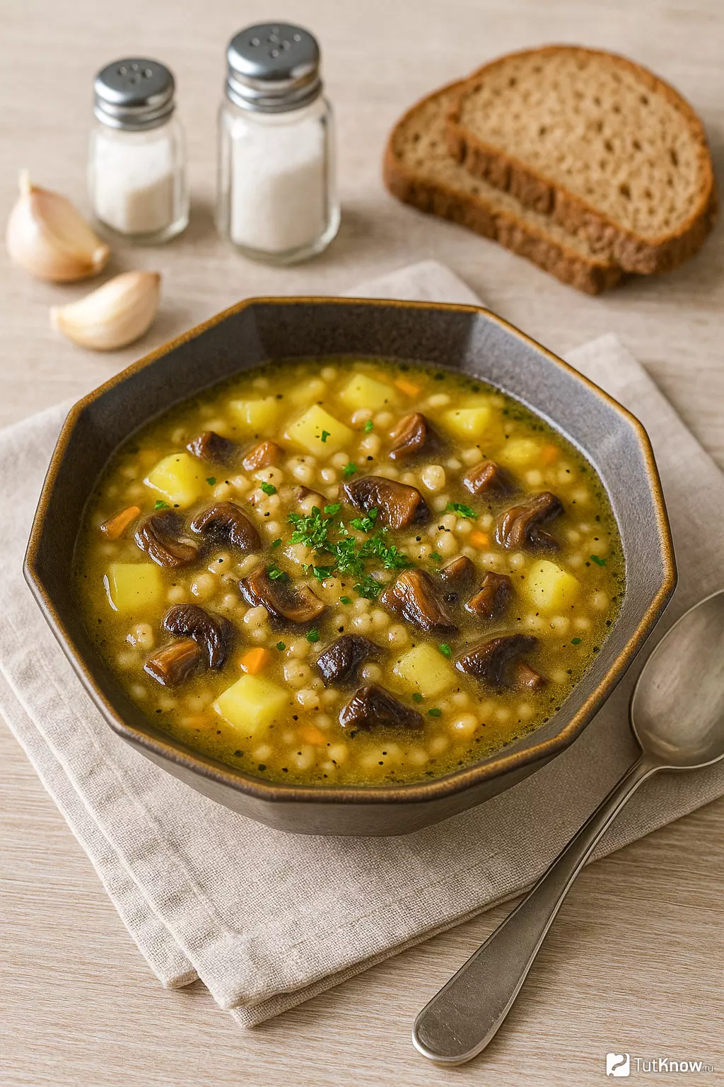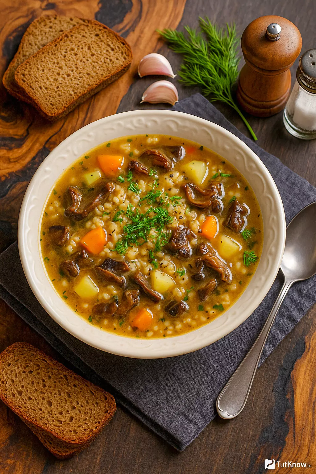 Суп из ячневой или перловой крупы и сушёных грибов — традиционное и питательное блюдо. Основные ингредиенты, сушёные грибы и ячневая крупа, придают супу насыщенный вкус и текстуру. Грибы обогащают ароматом и содержат витамины, а ячневая крупа — источник клетчатки и углеводов. Это блюдо особенно актуально в холодное время года и идеально подходит для обеда или ужина благодаря доступности ингредиентов.