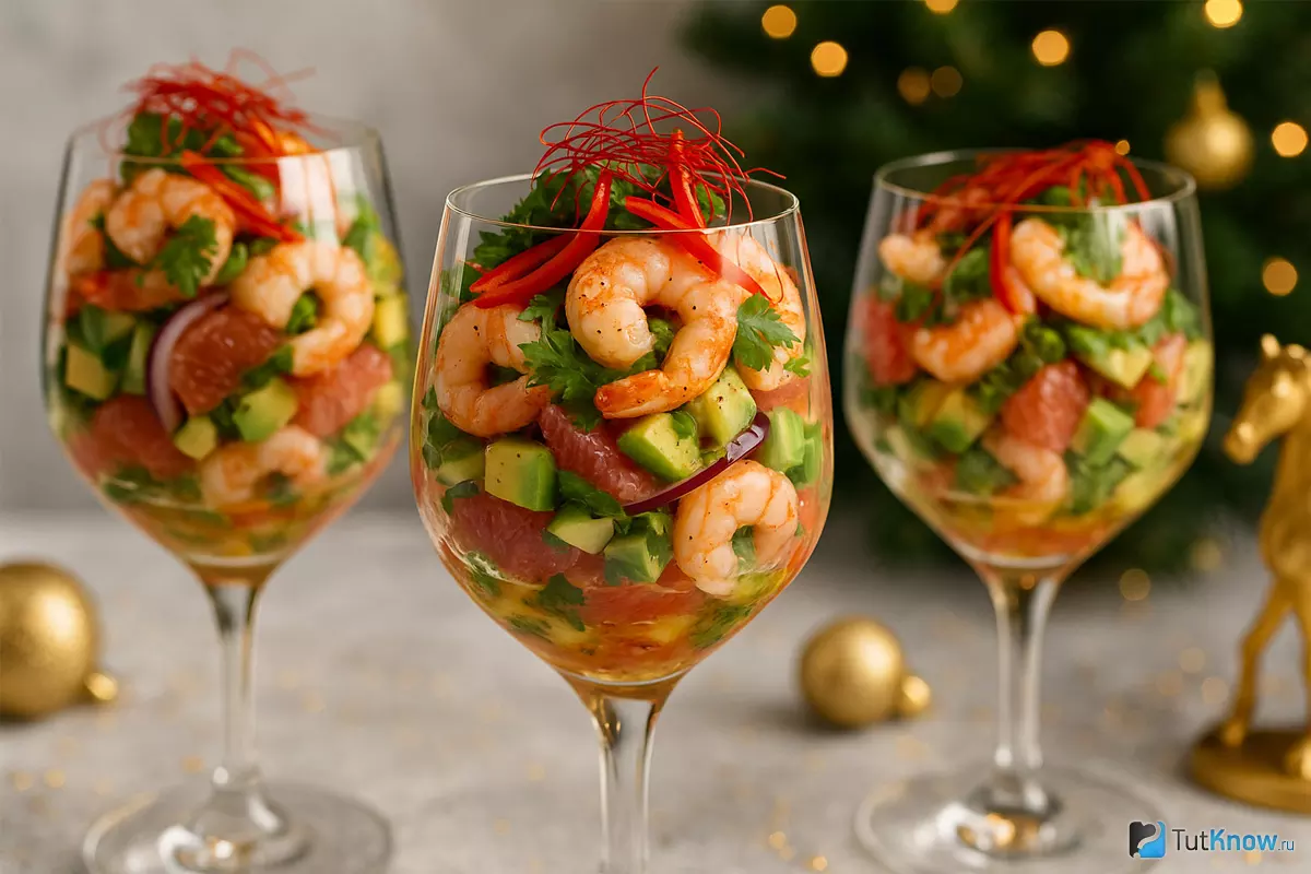 Новый год 2026 — это Год Красной Огненной Лошади, и символично встретить его блюдами в огненных тонах. Салат «Огненный галоп» сочетает в себе свежесть цитрусов, нежность авокадо и пикантность креветок, а лёгкая остринка соуса придаёт характер и «скорость» вкусу. Этот салат станет не только украшением праздничного стола, но и подарит ощущение лёгкости после плотных горячих блюд.