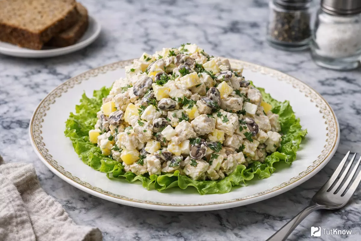 Салат с курицей и грибами — это сытное и сбалансированное блюдо, которое отлично подходит для ужина или плотного обеда. Нежное куриное мясо делает салат питательным, грибы добавляют насыщенный вкус и аромат, а картофель и яйца создают приятную, мягкую текстуру. Рецепт удобен тем, что его можно готовить как с жареными, так и с маринованными шампиньонами, каждый раз получая немного разный результат. Такой салат легко адаптировать под семейный стол или подачу для гостей, а ингредиенты остаются простыми и доступными.