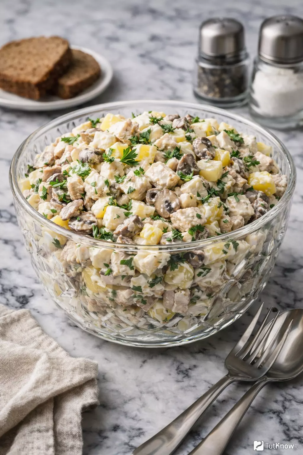 Готовое блюдо получается очень сытным, с выраженным вкусом грибов и нежного куриного мяса. Такой салат отлично хранится в холодильнике до двух суток, если накрыть его пищевой плёнкой или крышкой. Особенно вкусно он раскрывается, когда немного настоится. Подавайте его порционно или в общем салатнике — и домашние, и гости оценят! Лично мне нравится добавлять чуть больше зелени для свежести.